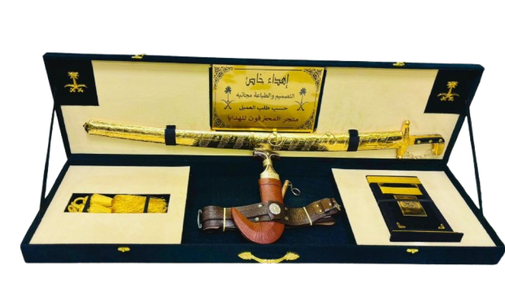 - يحتوي على سيف عربي فاخر وخنجر عماني ذهبي بتصميم أنيق.